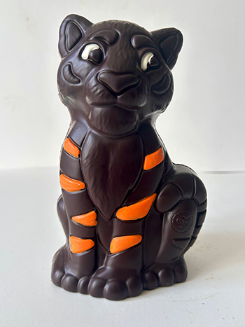PHOTO STATION MONT-ROYAL | Un chocolat qui fait rugir de joie sur les étalages bien remplies de la chocolaterie Chocolats Favoris. Notre choix, le très inoffensif Théo le tigre – Classique noir. Aussi disponible en chocolat au lait et caramel fleur de sel, mais toujours faits de cacao durable et équitable. 300 g, 27,99 $. |
