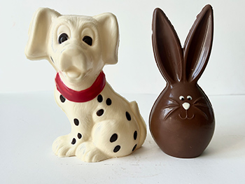 PHOTO STATION MONT-ROYAL | Au moment où vous lisez ces lignes, une production effrénée s’active dans les ateliers d’Alex Platel; la quantité de moulages est étourdissante, la variété époustouflante. Notre choix, l’irrésistible Dalmatien au chocolat blanc (23,95 $, 170 g) et le tout mignon Lapin Moustache au chocolat au lait (16,75 $, 110 g). |