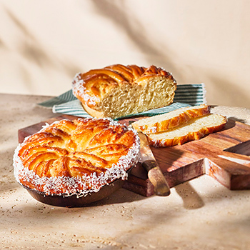 PHOTO COURTOISIE PREMIÈRE MOISSON | Les brioches tressées sont un classique de Pâques. Cette version ultra moelleuse est juste assez sucrée avec son équilibre parfait de saveurs douces et exotiques. Faite de beurre et d’œufs, garnie d’un mélange à base de chocolat blanc, de miel et de noix de coco. Le tout est tressé à la main, façonné en couronne et parsemé d’une touche additionnelle de noix de coco. 6,95 $. |