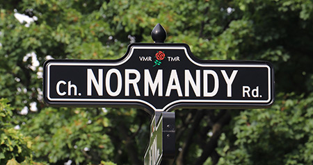 Cet odonyme (Normandy en anglais) évoque l’ancienne province de France, dont les origines remontent à l’époque romaine où elle fut unifiée. Au Moyen Âge, elle passa sous le joug de la dynastie des Plantagenet, qui régnait également sur l’Angleterre. Malgré que cette région conserva, au cours des siècles, une certaine indépendance, elle fut progressivement intégrée à l’espace géographique francçais. Aujourd’hui, elle est scindée en deux régions administratives : la basse et la haute Normandie. Mais, toutefois, ce nom rappelle également l’une des plus importantes campagnes militaires de la Deuxième Guerre mondiale. Les soldats canadiens participèrent à cette opération d’envergure des forces alliées, connue sous le nom de code Overlord, en débarquant le 6 juin 1944 sur les côtes normandes — dans le secteur appelé Juno. Pendant les semaines suivant ce débarquement, ils furent aussi associés à deux offensives majeures de la bataille de Normandie. Avec l’appui des troupes britanniques, les Canadiens libérèrent, le 9 juillet, la ville de Caen, tandis qu’ils s’emparèrent de Falaise le 16 août. Au cours de cette campagne militaire, la plus importante du XXe siècle, plus de 18 000 soldats canadiens y furent tués ou blesse