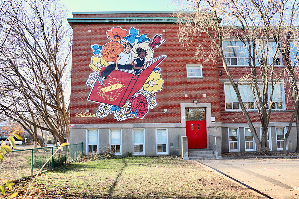 La fresque réalisée sur la façade ouest de l'école Dunrae Gardens est l’oeuvre de l’artiste montréalais Whatisadam, de son vrai nom Adam Vieira. L'idée de cette création est venue lorsque l’arbre, qui recouvrait alors ce mur du bâtiment, a laissé un grand vide derrière lui en succombant à l’épisode de verglas en avril. Mont-Royal peut maintenant se targuer d’avoir trois murales à ciel ouvert sur son territoire. En attendant de s’embrasser sous le gui, quoi de mieux que cette magnifique initiative fleurie pour clôturer l’année en beauté dans la cité-jardin!