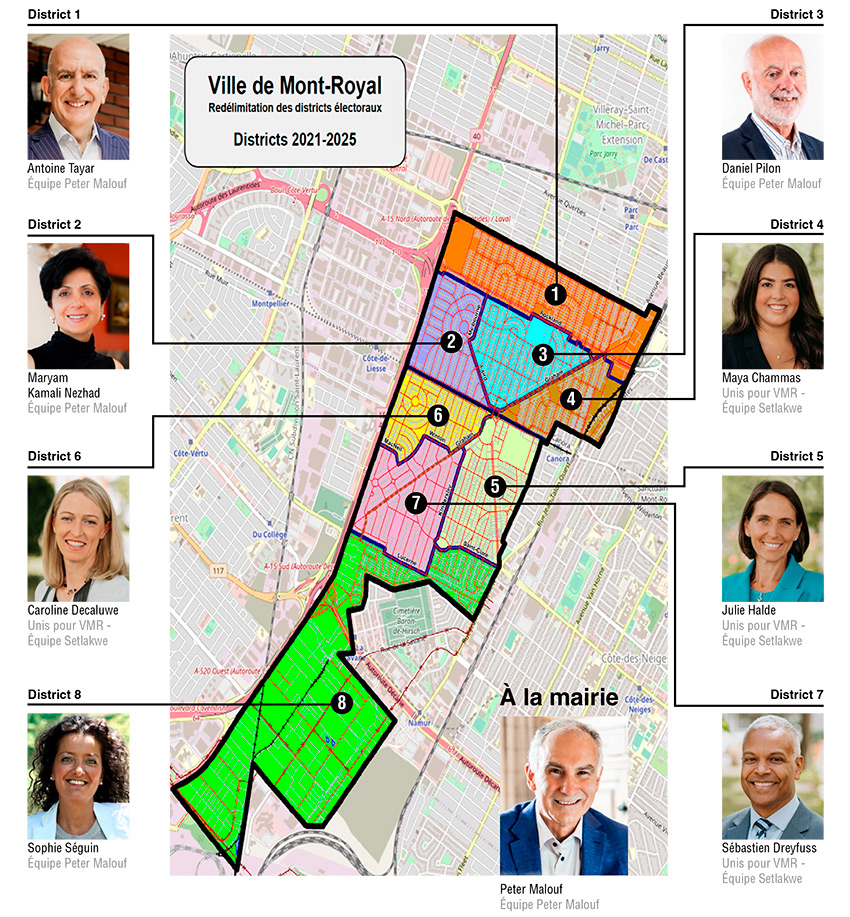 | Mont-Royal a voté et a porté au pouvoir Peter Malouf à la mairie ainsi que 4 candidats de son équipe aux postes de conseiller(ère)s, soit Antoine Tayar dans le district 1, Maryam Kamali Nezhad dans le district 2, Daniel Pilon dans le district 3, et Sophie Séguin dans le district 8. Les 4 autres districts seront représentés par les candidats élus de Unis pour VMR-Équipe Setlakwe : Maya Chammas (district 4), Julie Halde (district 5), Caroline Decaluwe (district 6), et Sébastien Dreyfuss (district 7). Voir les résultats détaillés en cliquant ici : ![]() |