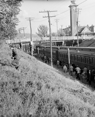 Le pionnier du photojournalisme au Québec, Conrad Poirier, a immortalisé ce moment en 1952, à la gare de Ville Mont-Royal, où des voyageurs descendent du train de banlieue.