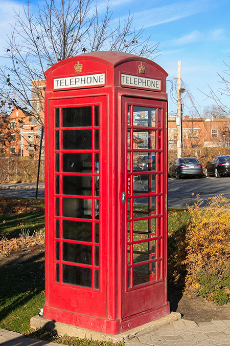 La cabine téléphonique sur le croissant Lombard, face au parc Connaught. Cette photo a été prise en 2015. PHOTO STATION MONT-ROYAL ARCHIVES La question est de savoir pourquoi cette cabine téléphonique rouge – qui est une icône londonienne de renommée internationale – est arrivée ici, à l’époque. Cela reste encore en suspens.
