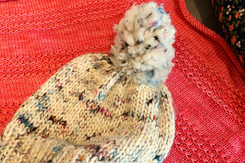 Chacune des membres présentes ce jour-là avait apporté une création unique. Sur la table, châle, foulard, bonnet, couverture et courtepointe faits main notamment, incarnent la passion, bien palpable parmi ce groupe, il faut le dire. Mais de toutes les pièces artisanales, c’est celle de Marion Landry qui faisait le plus jaser.