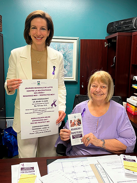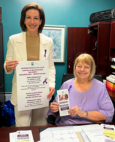La députée de Mont-Royal-Outremont, Mme Michelle Setlakwe a souligné à l’Assemblée nationale le 8 juin dernier, le travail de Mme Jan Lauer, régisseuse des loisirs, section Aînés, et son initiative de créer la campagne « Regardez-moi!, Respectez-moi! », dans le cadre du de la Journée mondiale de sensibilisation de la maltraitance des aînés le 15 juin prochain. Mme Setlakwe a fait le souhait que cette initiative locale soit déployée à toutes les régions du Québec afin de contrer toute forme de maltraitance envers les aînés. En support Mme Setlakwe également porté le ruban violet, symbole de la campagne « Regardez-moi!, Respectez-moi! ».