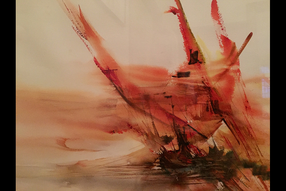 L’Égypte. Voici une production récente, qui s’appelle Mats au vent. Elle vient de remporter le 3e prix de l’exposition annuelle de l’Atelier d’aquarelle Le Partage (un groupe d’aquarellistes de Laval). C’est une inspiration des felouques d’Égypte… puis ce ton de rouge est aussi une couleur très présente là-bas. Mais c’est une création tout à fait spontanée, car ça doit faire à peu près 15 ans que je suis allée en Égypte, je pense. -