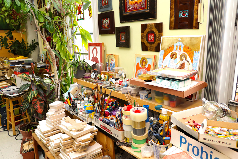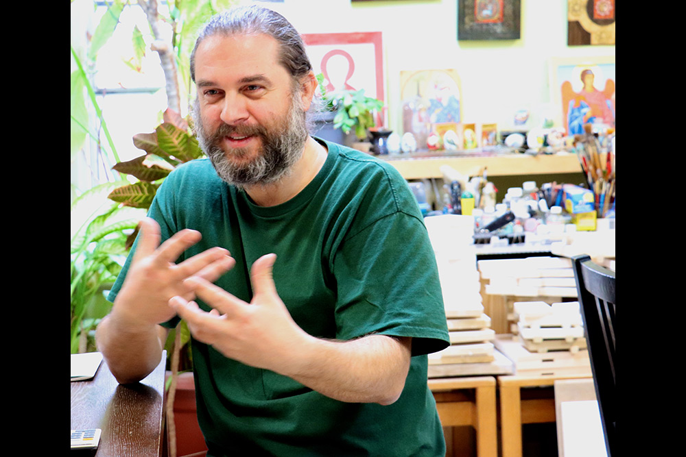 « Donc, oui, il y a probablement des restants de tout ça quelque part dans mon ADN », s’inclinera finalement à dire plus tard ce verbomoteur, tout en dépoussiérant les tables de son atelier où se déroule l’entretien. Vladimir bricole lui-même toutes les pièces de bois qui servent de support aux icônes pour ses étudiants,« parce que, malheureusement, il n’y a pas d’Ikea pour les iconographes ! », s’amuse l’ébéniste de service.