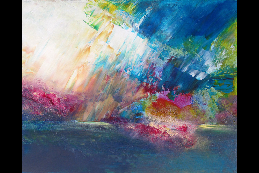 Notre hôte a quelque chose d’éthéré chez elle. C’est beau. Comme un mélange de candeur d’enfant et de femme quinquagénaire épanouie artistiquement. Mais elle l’avoue d’emblée: « j’ai mis des années et des années avant d’arriver à ça. En fait, cela ne fait même pas dix ans que je me laisse vraiment aller sur un chevalet avec la couleur ».